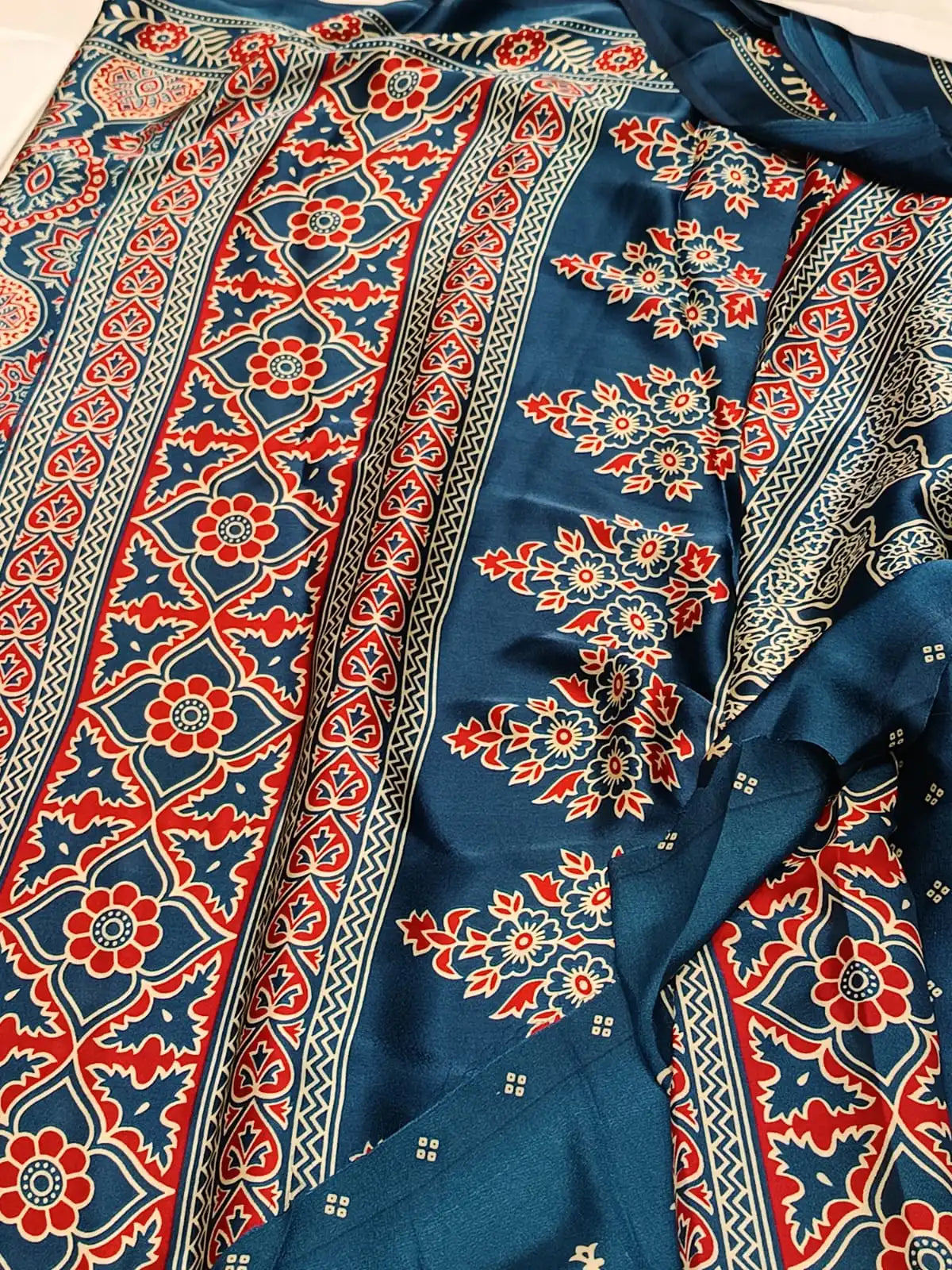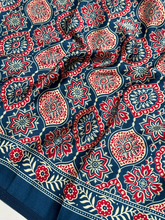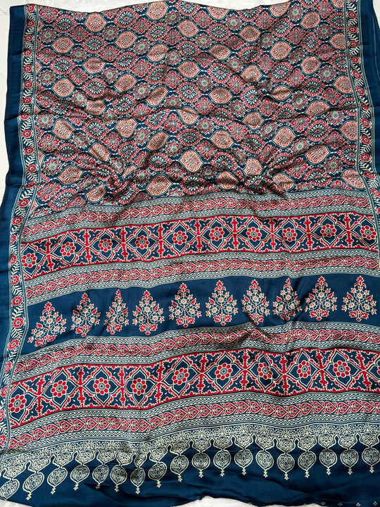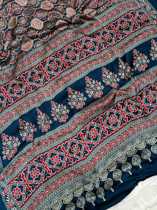 Indigo Morpich Ajrakh Printed Soft Modal Silk Natural Print Saree
