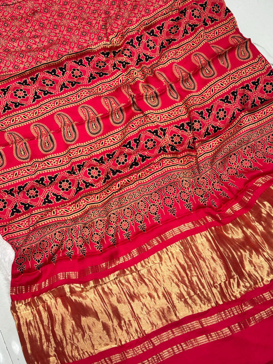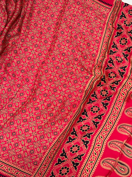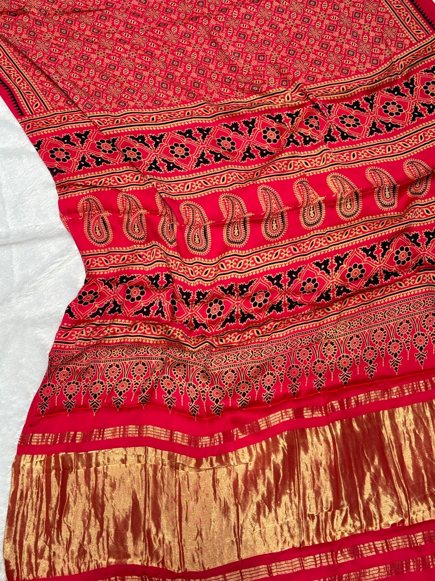 Pink Ajrakh Hand Block Modal Silk Saree With Zari Pallu